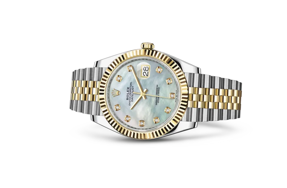 リファレンス126333ケースオイスター、41 mm、オイスタースチール&イエローゴールドベゼルフルーテッド防水性能100 m/330 フィート防水ムーブメントパーペチュアル、機械式、自動巻キャリバー3235、ロレックスによる完全自社製造パワーリザーブ約 70 時間ブレスレットジュビリー(Jubilee)、5 列リンクダイアルダイヤモンド入りホワイトマザーオブパール認定高精度クロノメーター (COSC、ケーシング後にロレックス認定)