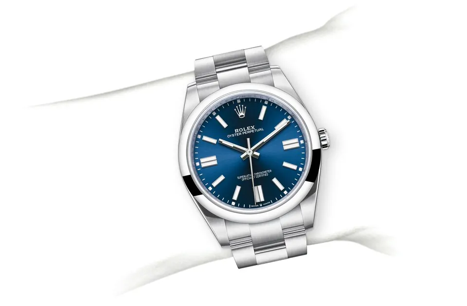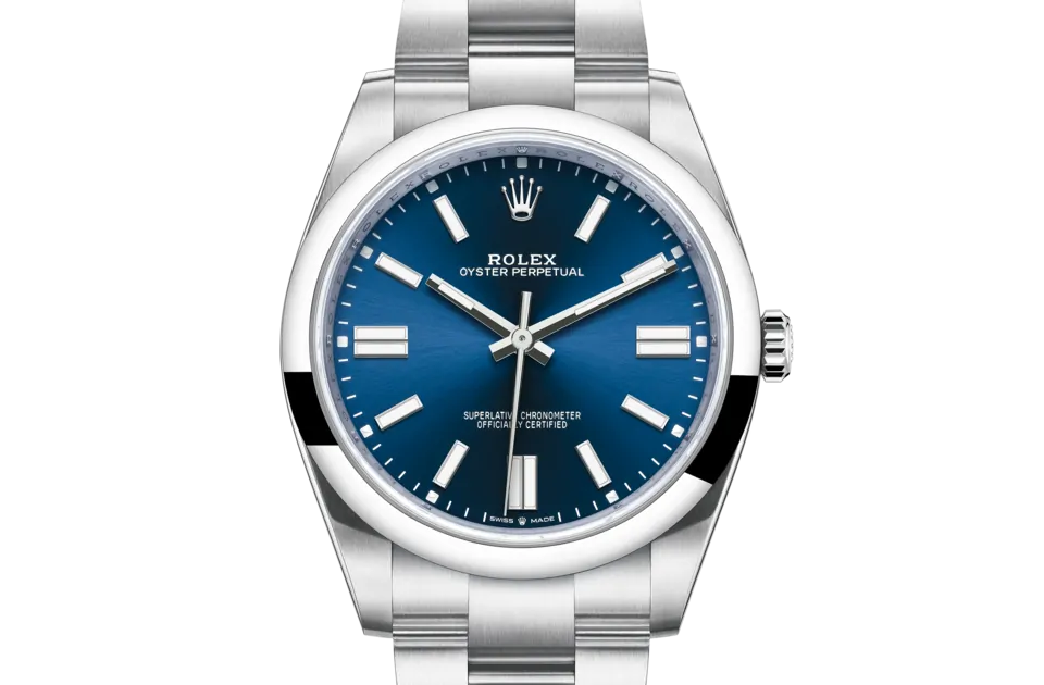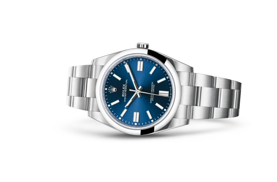 サンレイ仕上げは、オイスター パーペチュアルコレクションの多くのダイアルに繊細な光の反射をもたらす。これはダイアルの中心から外側に向かって溝を作る、熟練のブラッシング技術によるものだ。