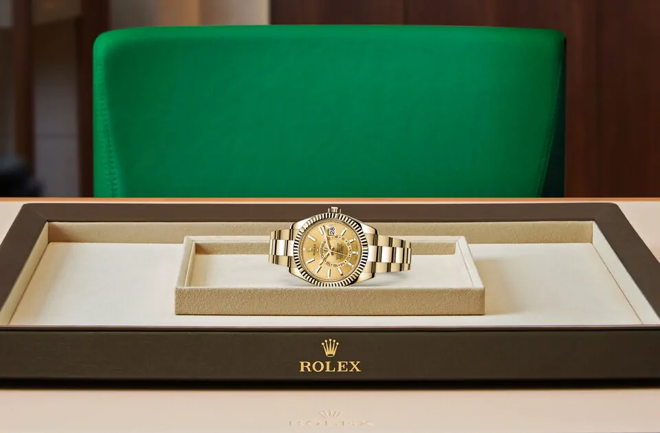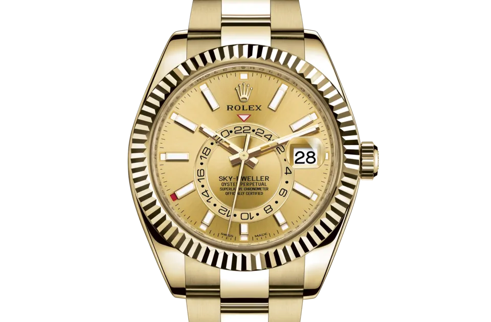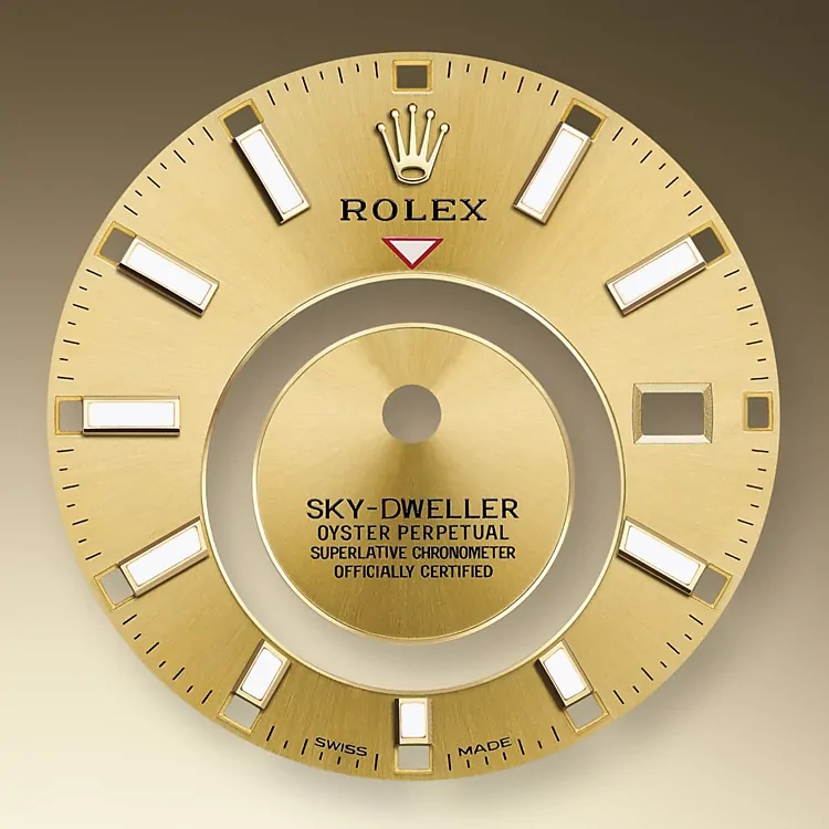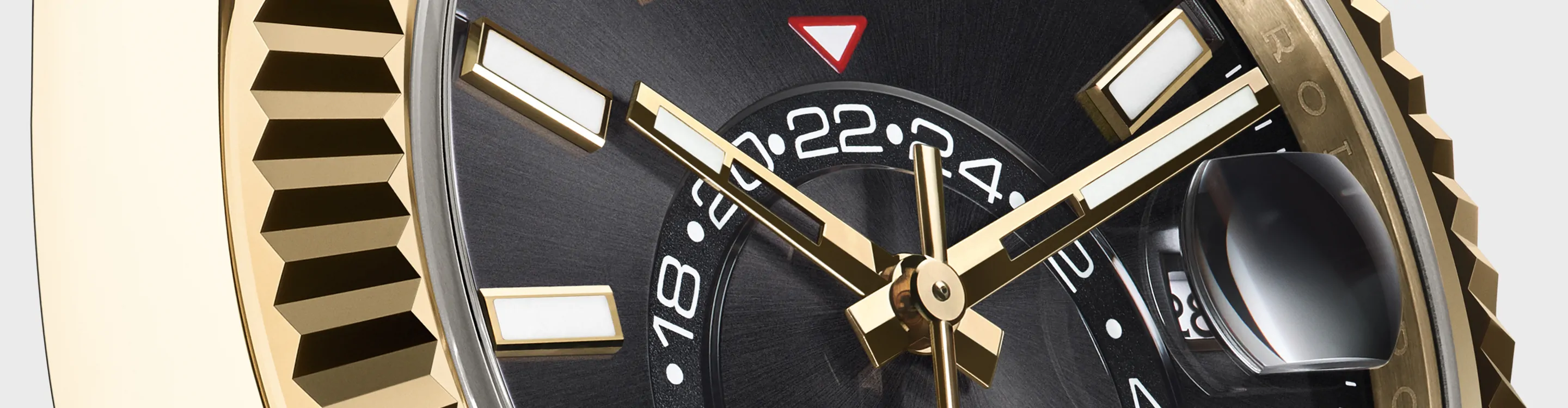 ダイアル上の赤い逆三角形が、居住地や勤務地の時刻など、ホームタイムを24時間表示の回転ディスクで表示する。このディスクの24時間表示により、ホームタイムの午前と午後を瞬時に判断することができる。